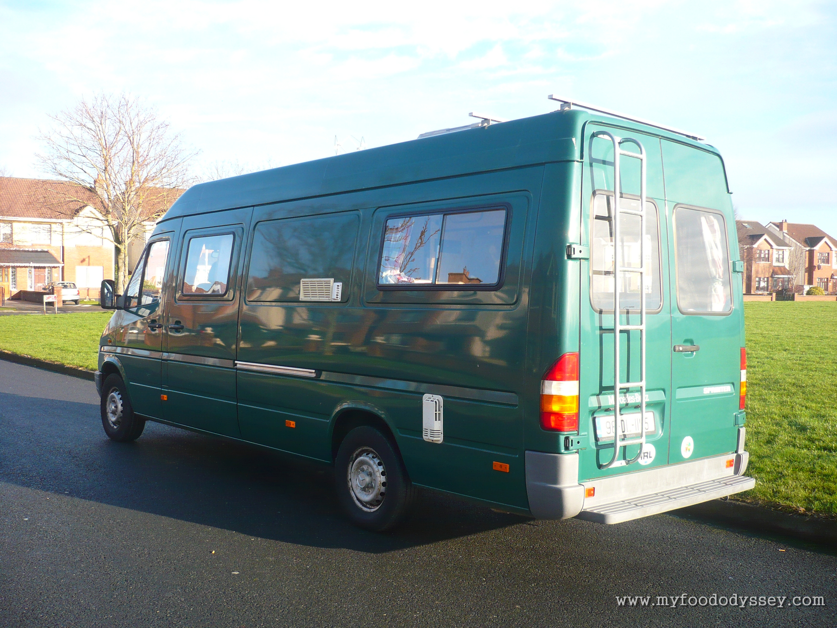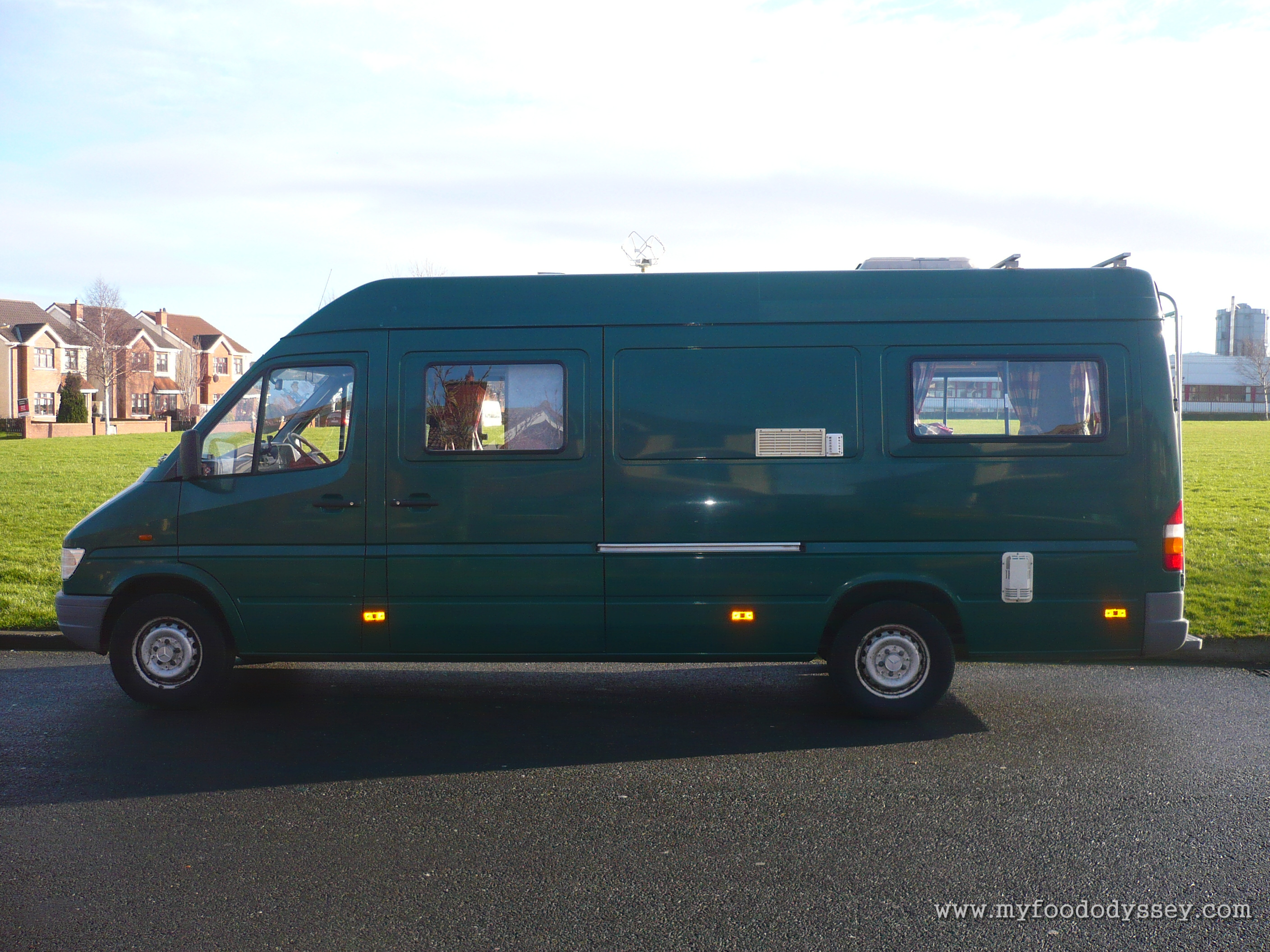 Our beautiful new camper van. Our beautiful new camper van. For the techies, it’s a ’98 Mercedes Sprinter 2.9 Diesel with 62k miles. I’m very happy that it’s not white – it doesn’t stand out as much. The awning had not been installed when this picture was taken. It runs from above the sliding door to the end of the side window.