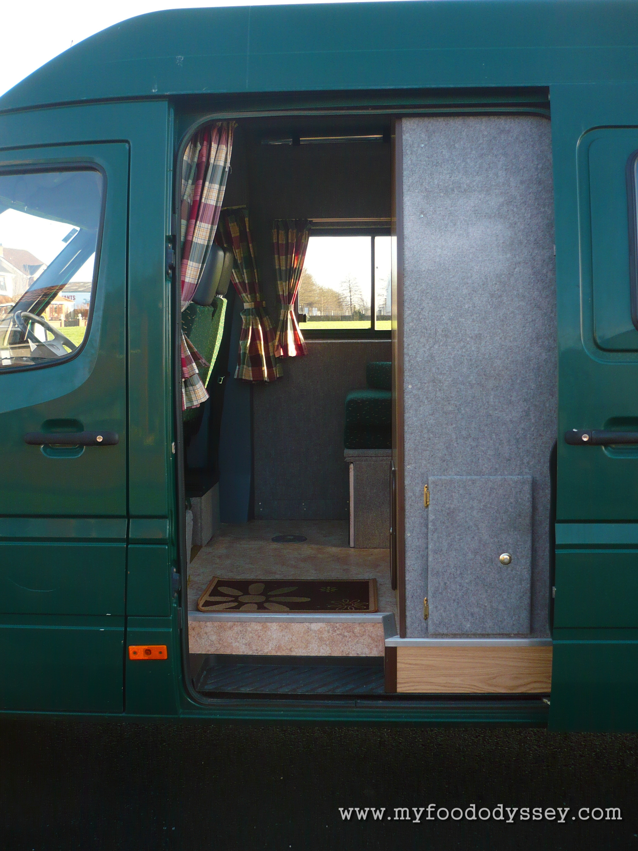 Moving along towards my favourite area - the kitchen! Moving along towards my favourite area – the kitchen! The long door on the left leads to the “bathroom”. You can see that the door is raised slightly off the floor, like a door on a boat. This is because the whole unit acts as the shower unit, so the raised door prevents the water running out.