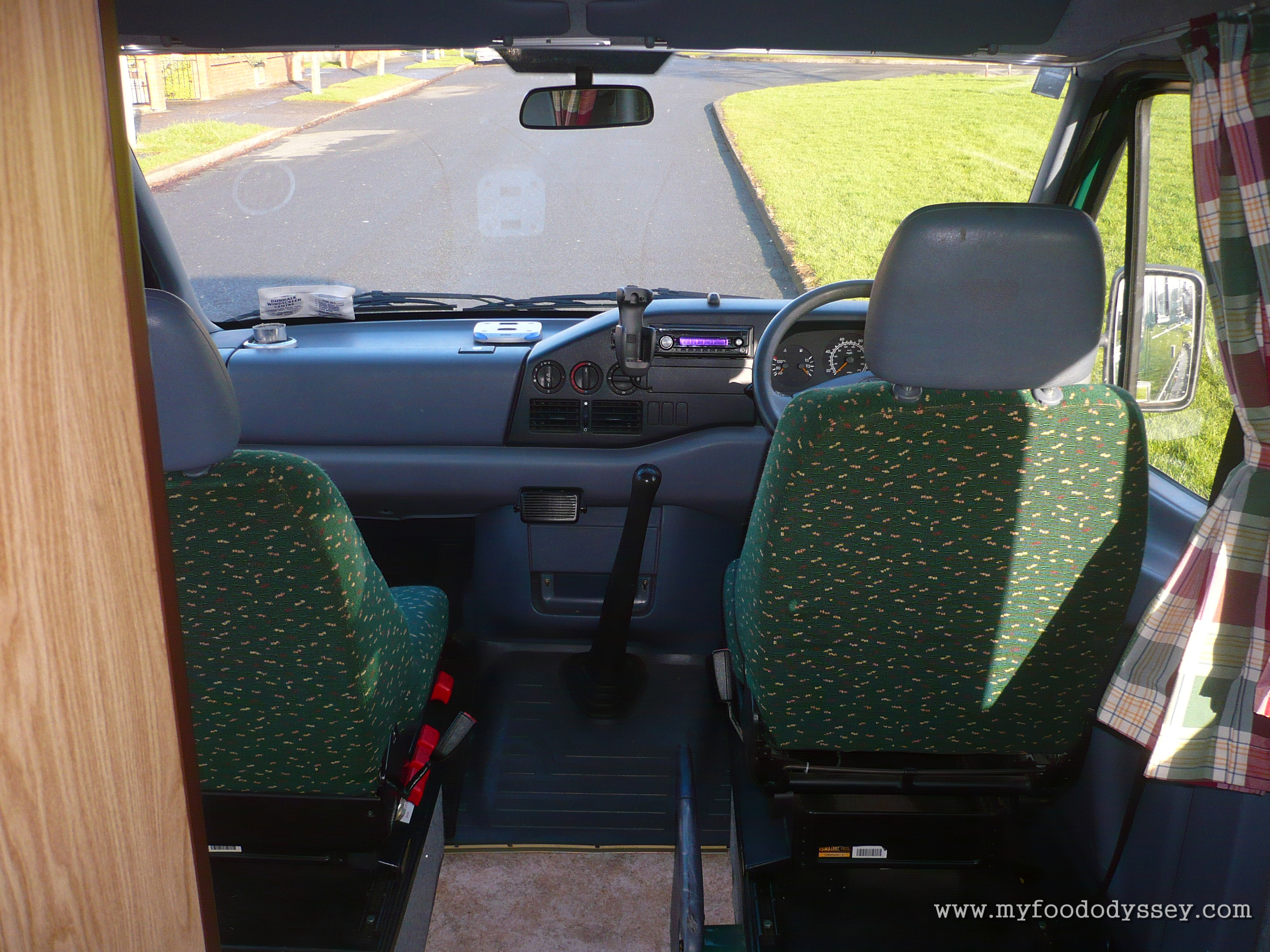 The cab, complete with panoramic view and swivel seats. The cab, complete with panoramic view and swivel seats. We’d have preferred a left-hand drive as most of our driving will be done on the right-hand side of the road. However, Arūnas is comfortable with the right-hand drive. There’s a third seat behind the driver’s seat, not visible in the picture. This seat converts into a single bed.