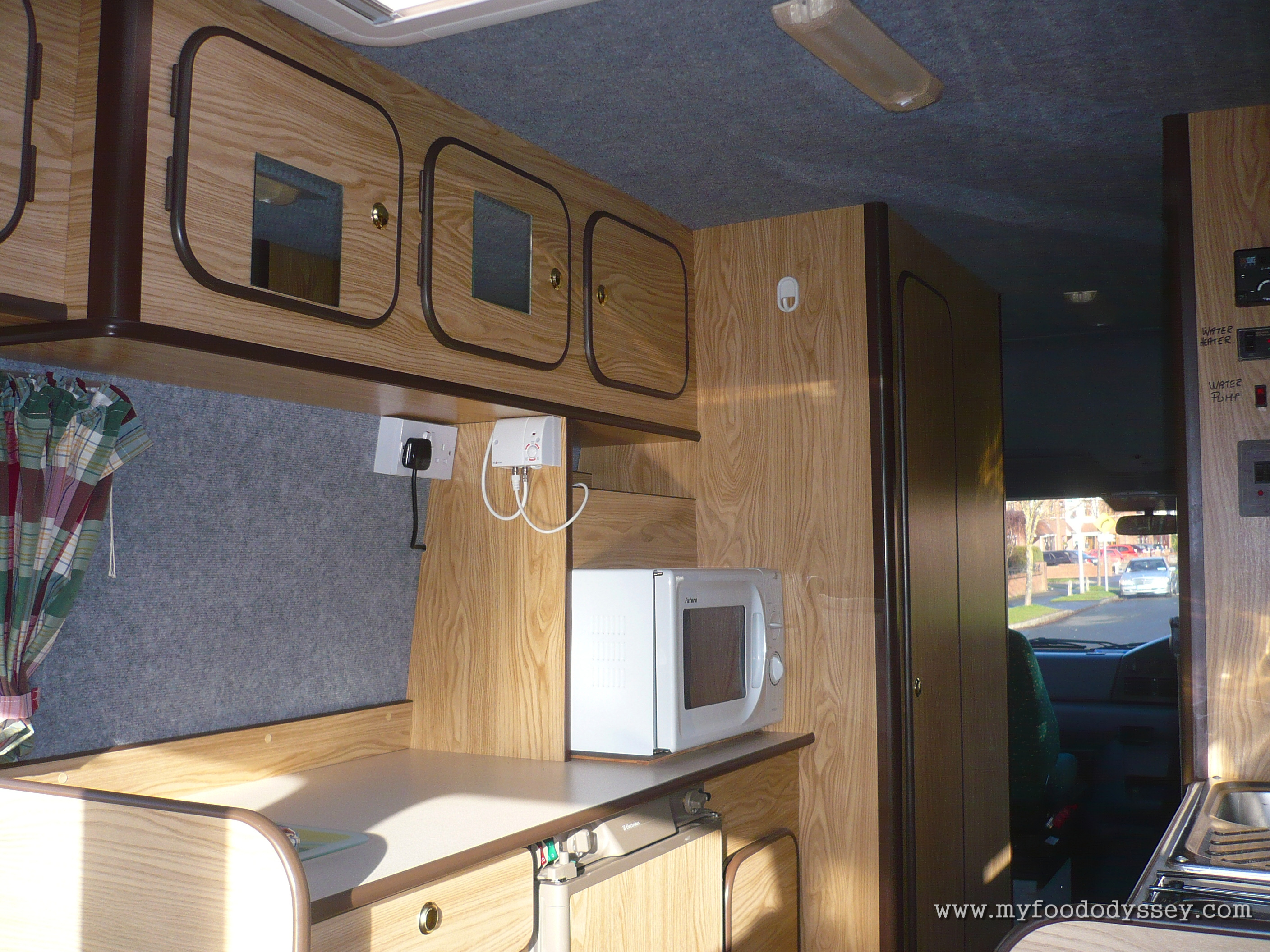 I just love this bright, sunny space for preparing food. I just love this bright, sunny space for preparing food. I looked at lots of camper vans and few had as much counter space as this. We’ve now removed the microwave to add even more space.
