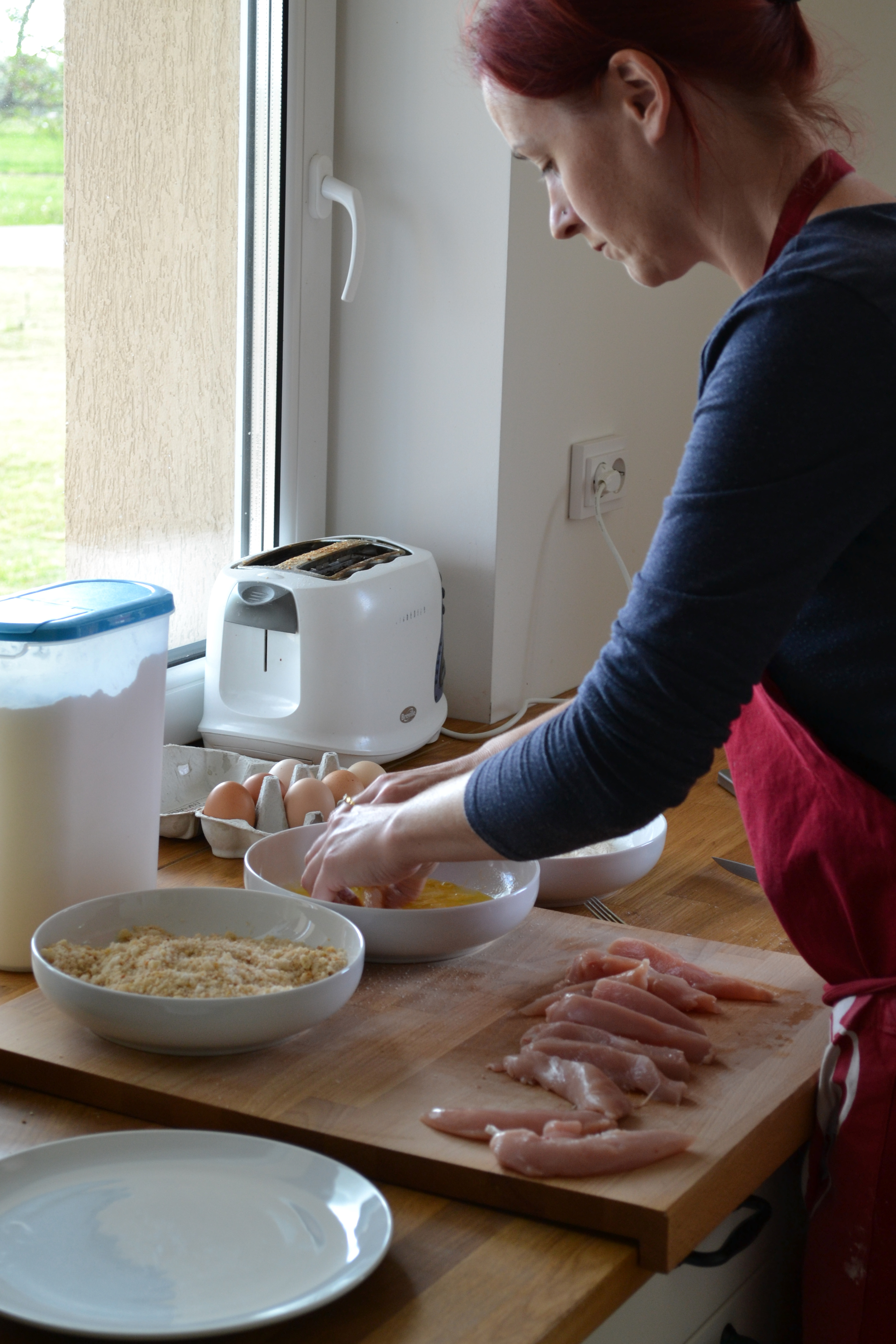 Making chicken goujons for dinner using my own homemade sourdough breadcrumbs.